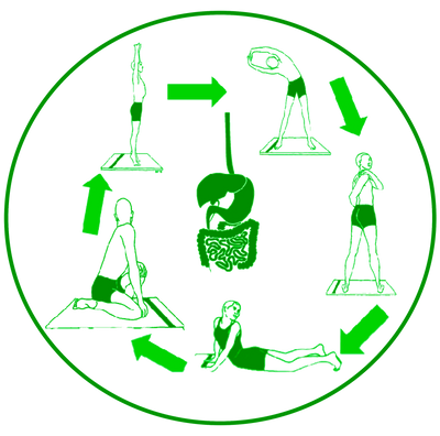 Fourth asana of shankh prakshalana is TIRYAKBHUJANGASANA. It opens the ileocecal sphincter muscle that is a valve which separates the small intestine and large intestine. It limits the backflow of large intestine contents into small intestine also. By tiryakbhujangasana, that ileocecal valve opens and saline water enters into large intestine.